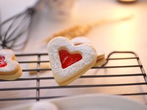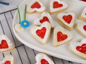 -Sprinkle icing sugar on hollow heart cookies.